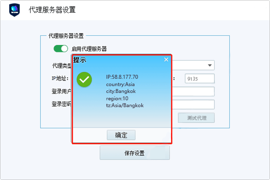 单击“代理测试”按钮,如果显示的目的IP和地址为您请求的地址,则表示配置成功